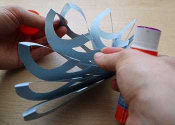 Using a gluestick, tape, or stapler (with supervision), secure these two halves together by gluing, taping or stapling (with supervision) the outside paper layer of each snowflake half together.