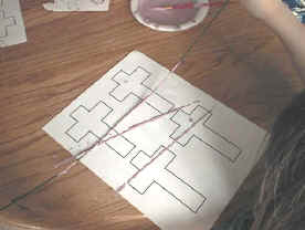 - Pull the string tight and put onto the cross template.